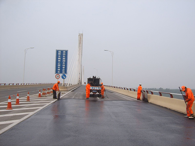 橋面防水施工的第二步是進(jìn)行涂刷涂料。這一步就真的到實(shí)際的防水處理了。首先,要對修復(fù)后的空洞、施工留下的縫隙等特殊位置進(jìn)行預(yù)先的涂刷,進(jìn)而加強(qiáng)這些部位的防水能力。其次,涂料要進(jìn)行多層的涂刷,從橋面的一邊開始進(jìn)行整面的涂刷,涂刷完畢后再沿著與上一次涂刷垂直的方向進(jìn)行二次涂刷,每次涂刷都要在上一次涂刷凝固后進(jìn)行。