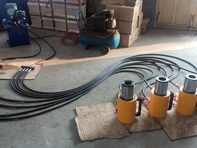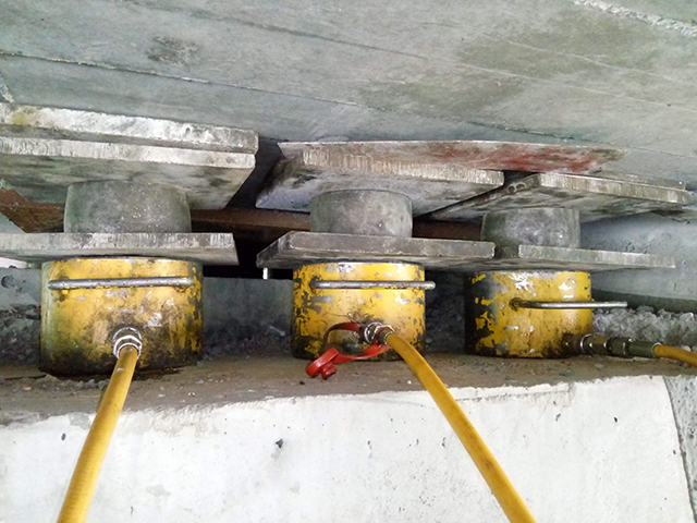 橋梁頂升即是在原橋臺(tái)附近開(kāi)挖基坑澆筑臨時(shí)砼作為頂升支架的基礎(chǔ),頂升支架采用無(wú)縫鋼管,無(wú)縫鋼管加工高度根據(jù)現(xiàn)場(chǎng)情況實(shí)測(cè)高度進(jìn)行加工,保證同軸無(wú)縫鋼管上部放置工字梁面處于同一高度,鋼管上放置頂升用千斤頂,千斤頂上放置工字梁作為分配梁與梁底之間用組合鋼楔緊密接觸。并在橋臺(tái)或墩柱外側(cè)安裝防位移裝置(高度根據(jù)現(xiàn)場(chǎng)實(shí)際情況而定)。頂?shù)轿缓舐淞簤|好臨時(shí)支撐柱。在原橋臺(tái)、墩上進(jìn)行支座墊石放樣,鑿除埋設(shè)支座墊石基槽并打磨平整,調(diào)制環(huán)氧砂漿安放支座墊石,對(duì)支座墊石進(jìn)行焊接,然后安放橡膠支座并找平、落梁。
